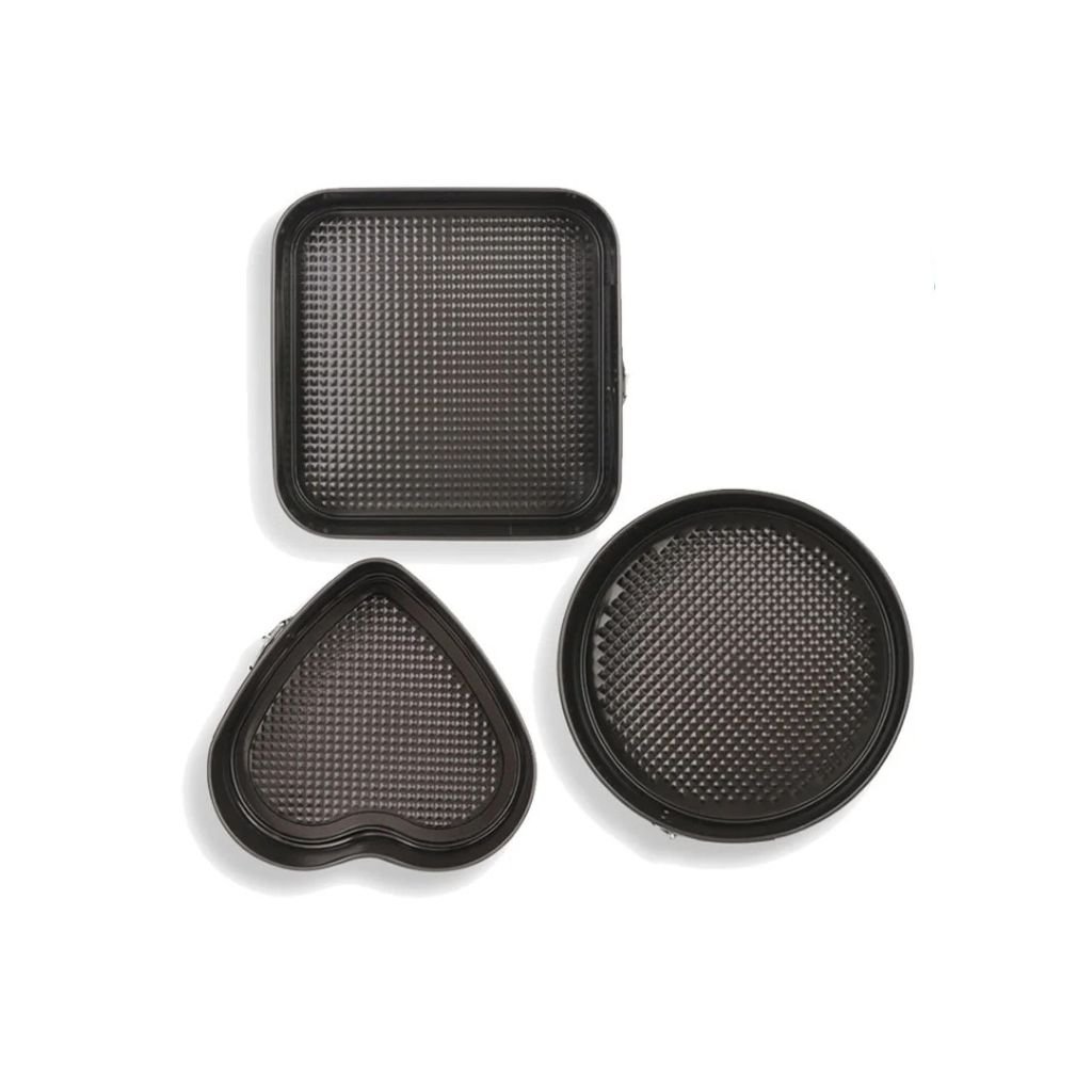 Bake with precision using the 3 in 1 Cake Mould set. Includes round, heart, and square springform pans with non-stick coating and easy-release latch — perfect for layered, shaped, and celebration cakes.