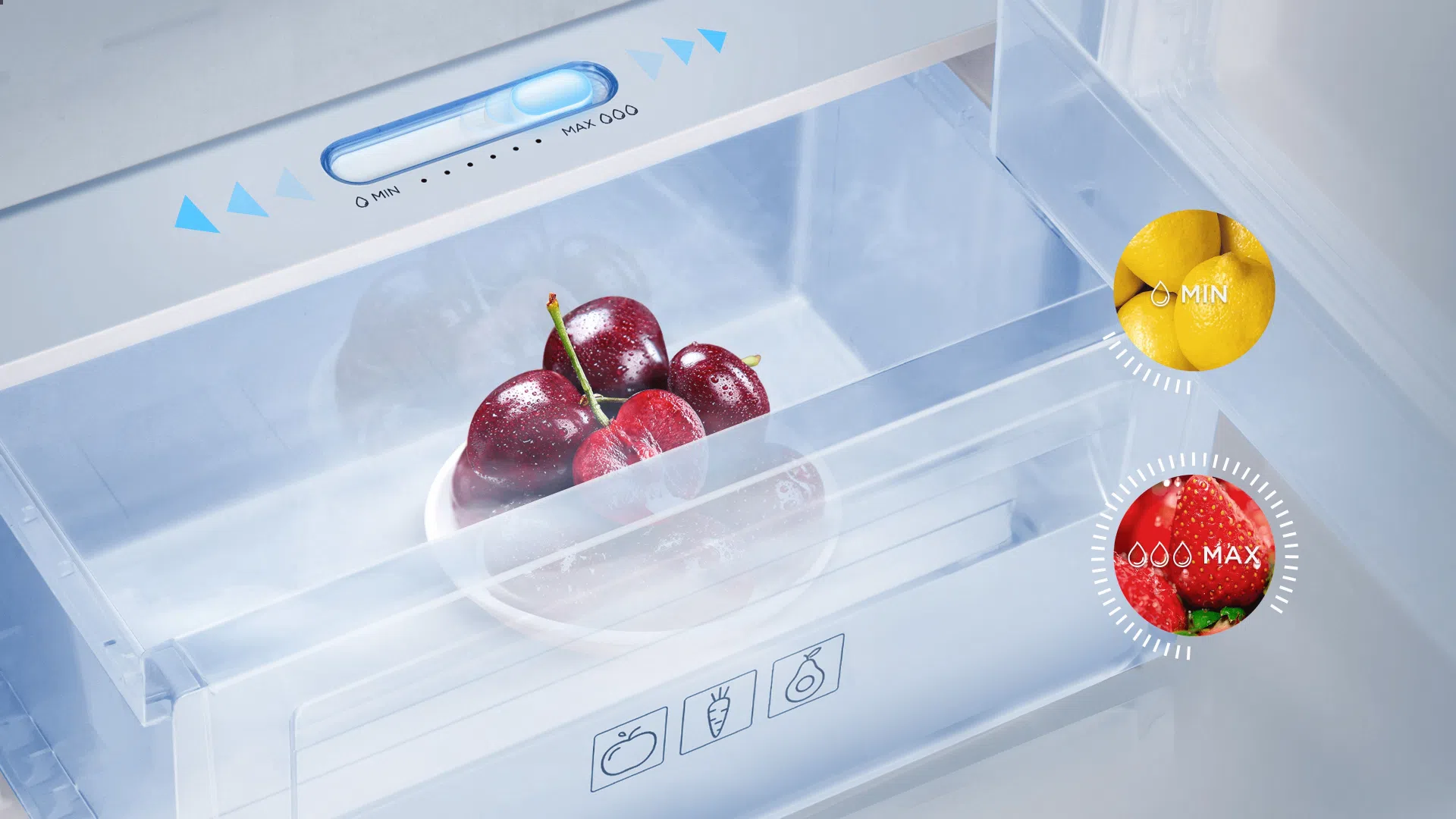 Humidity-Care Crisper: Don’t throw away greens that are wilting. The vegetable drawer has an adjustable humidity slider that lets you make the best environment for different kinds of fruits and vegetables.